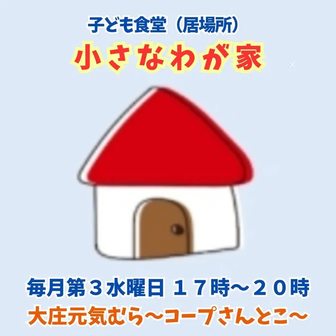 小さなわが家 住所 大庄西町3ー10-1「大庄元気むら~コープさんとこ~」 日時 第3水曜17:00~20:00 主催者 小さなわが家 連絡先 kazu.mutsu.asachi@gmail.com(吉川)